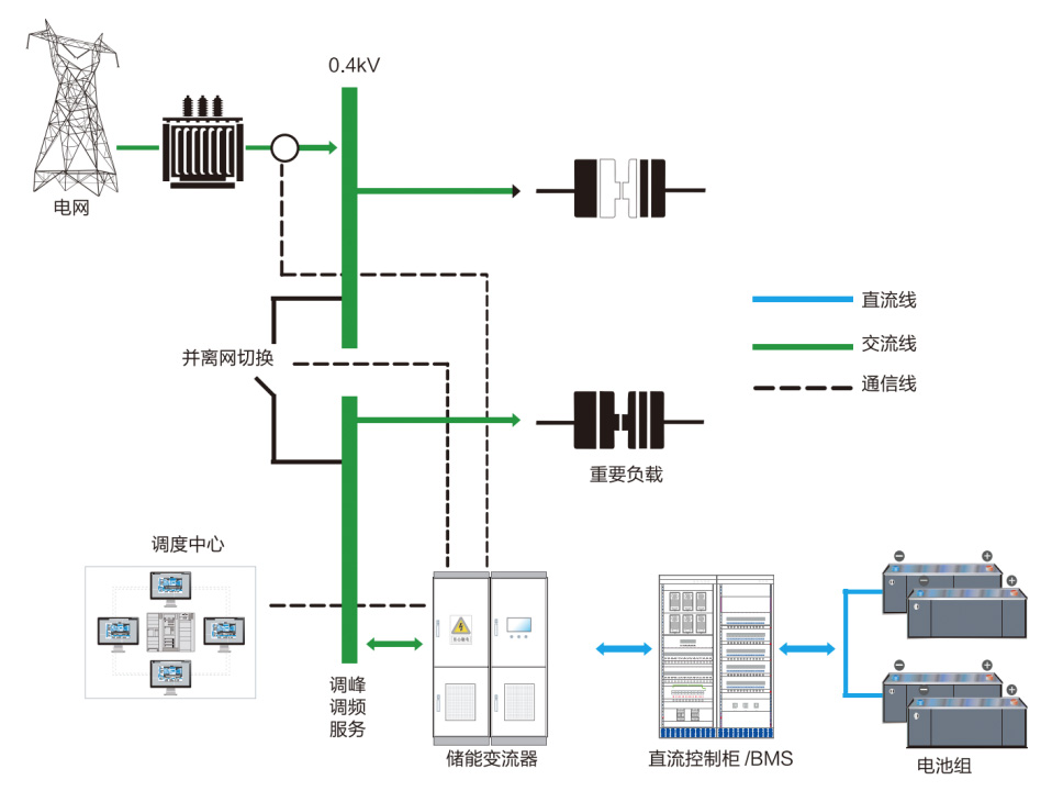 用户侧储能解决方案采用交流组网设计,兼容现有配电系统,实现快速灵活接入,有效平滑生产负荷波动,避免冲击性用电对电网的影响。