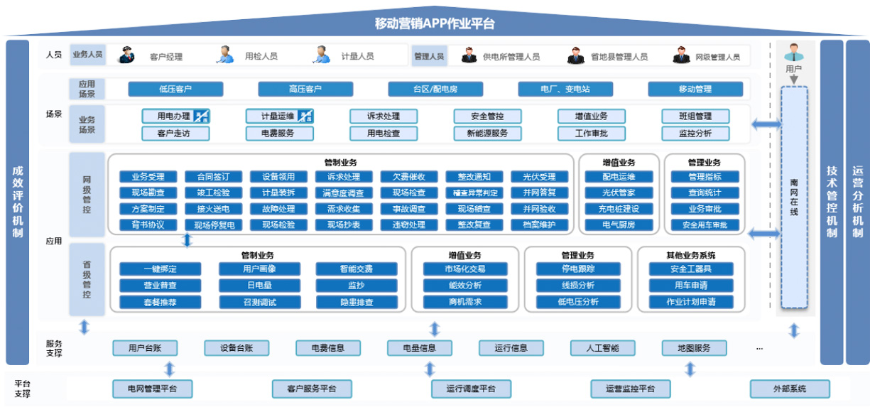 移动营销系统以深化营销、简约管理为总体目标,提供业扩、计量、用电检查、抄核收、客户服务、增值业务等六大营销基础业务模块,有效支撑营销全业务流程办理;通过建立作业工具、管理工具、辅助工具三大板块,将业务、场景、角色进行有效融合,构建了“好用-作业工具、易用-辅助工具、管用-管理工具”的一体化营销综合应用APP,推动营销业务服务方式向“全场景、多触点”方向转变。